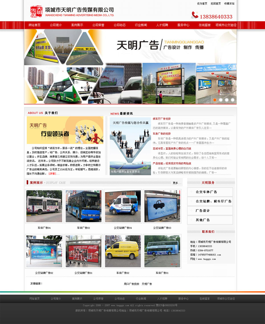 案例介紹:項(xiàng)城市天明廣告?zhèn)髅接邢薰境闪⒂?004年,前身為項(xiàng)城市公交公司廣告部。是專(zhuān)注于公交傳媒的專(zhuān)業(yè)戶外廣告公司,獨(dú)家擁有公交車(chē)傳媒資源200多臺(tái)、210多座公交候車(chē)亭燈箱、近300個(gè)公交站牌的廣告經(jīng)營(yíng)發(fā)布權(quán),另有2000多平方的戶外大型廣告牌10余處。提供廣告設(shè)計(jì)、制作、發(fā)布、監(jiān)測(cè)、維護(hù)的一體化全程服務(wù)。