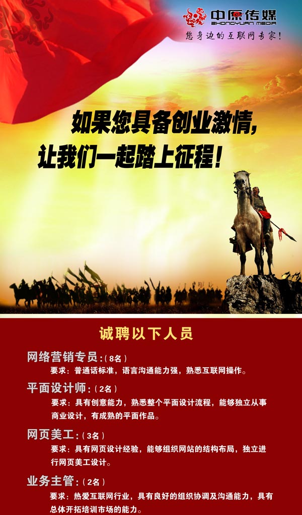 應(yīng)聘須知:中原傳媒要求應(yīng)聘者要具有挑戰(zhàn)的精神,具有創(chuàng)業(yè)的激情,認(rèn)同公司的發(fā)展,能與公司長(zhǎng)期的一起發(fā)展下去。意向者請(qǐng)發(fā)簡(jiǎn)歷至公司信箱zkzycm@163.com,或者直接電話聯(lián)系13939438668